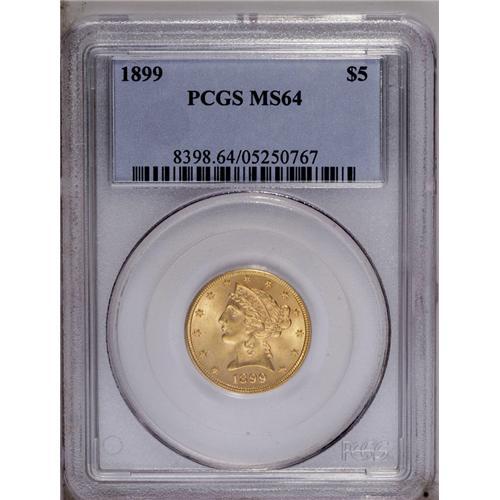<B>1899<$5> MS64 PCGS.</B></I> A beautiful Choice Liberty five dollar piece with uncommonly attractive eye appeal for the grade. Well struck save for the base of the 1 in the date.