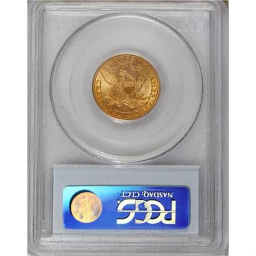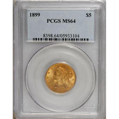 <B>1899 $5 MS64 PCGS.</B></I> This satiny and unperturbed turn-of-the-century gold coin has a penetrating strike and rich orange toning. A charming near-Gem certain to please its next owner.<BR><BR><b>Shipping:</b> Coins & Currency (<a target="_blank" href="http://www.heritageauctions.com/common/shipping.php">view shipping information</a>)