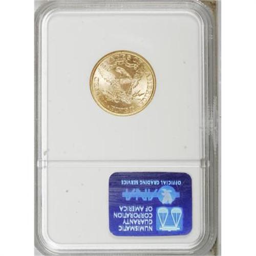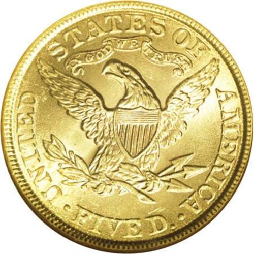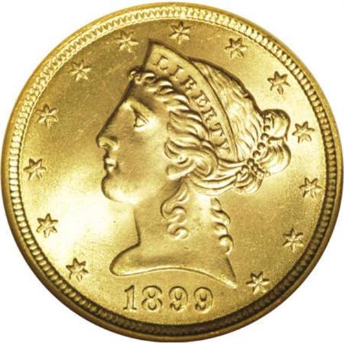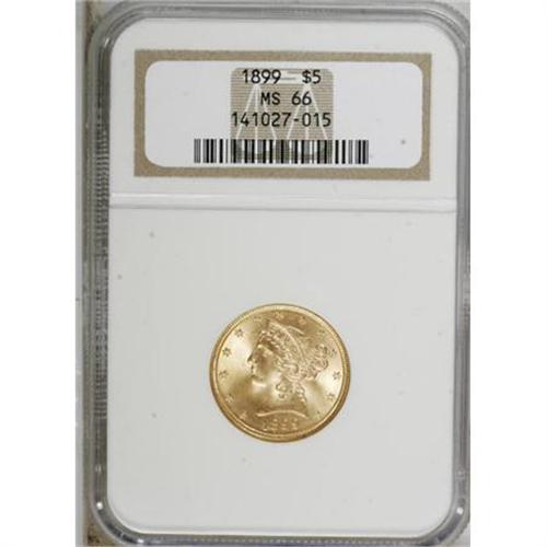 <B>1899 $5 MS66 NGC.</B></I> Bright, sparkling mint luster characterizes this superlative type coin. Always popular as the final year of the 19th century, the 1899 is also a relatively common coin (except in MS66 and better grades). Sharply defined throughout, the surfaces show almost no abrasions or luster grazes. Census: 63 in 66, 7 finer (12/07).<BR><BR><B>Coin Engraver:</B> Christian Gobrecht<BR><BR><b>Shipping:</b> Coins & Currency (<a target="_blank" href="http://www.heritageauctions.com/common/shipping.php">view shipping information</a>)