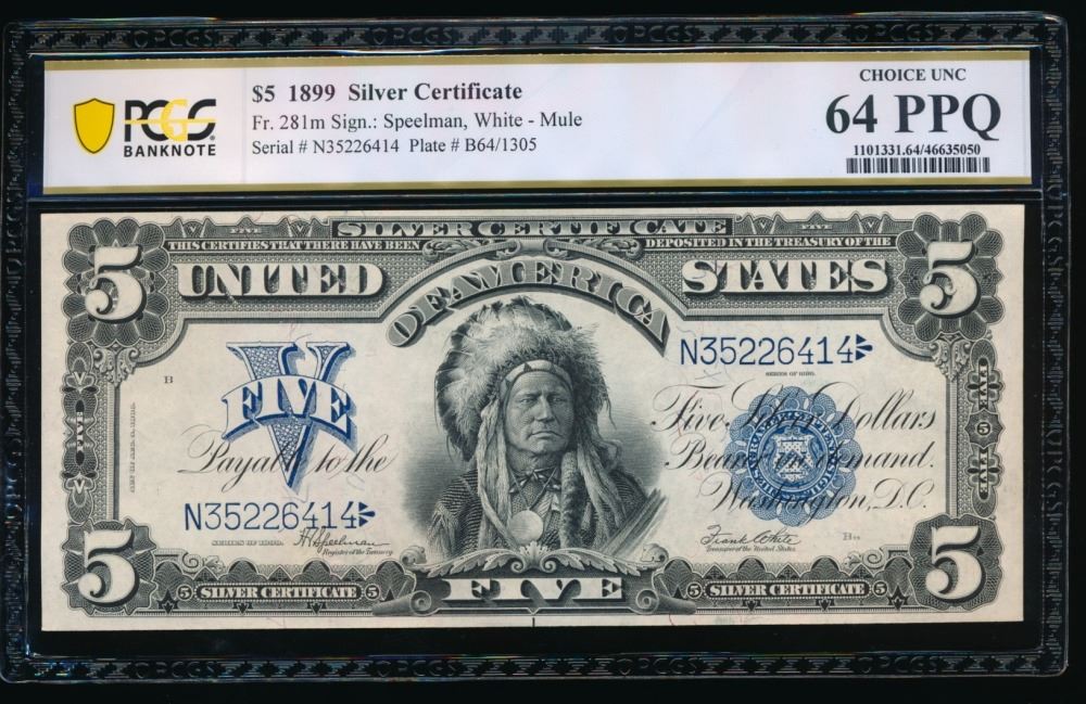 One 1899 $5 Mule Chief Silver Certificate PCGS 64PPQ.