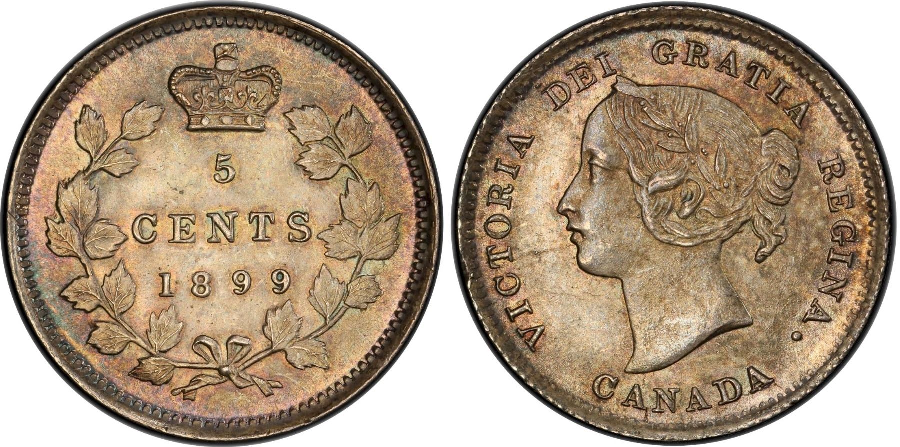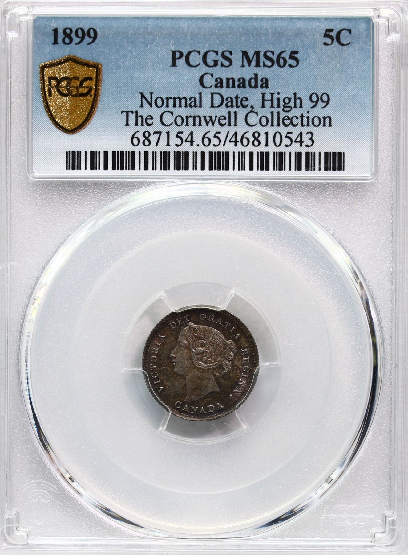 1899 5¢ Narrow Date "High 99" ICCS Gem Mint State-65. Appealing coin with nice colours. Scarcer variety rarely offered. Ex. Cornwell