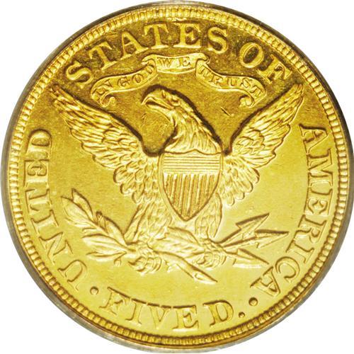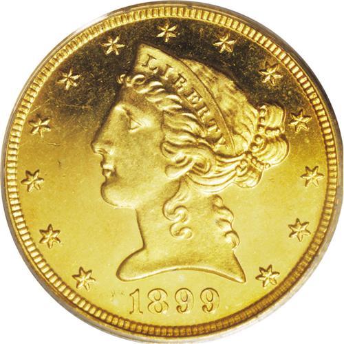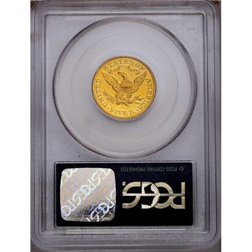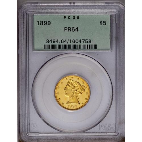 <B>1899<$5> PR64 PCGS.</B></I> While the production of business strike half eagles, both in Philadelphia and at the San Francisco facility, reached significant numbers as the 19th century drew to a close, its proof half eagle counterpart is seldom offered. Even the official mintage of just 99 pieces fails to convey the rarity of the issue. This specimen is almost certainly the same piece offered in our 1996 ANA Sale, a coin that was then uncertified, but now resides in a PCGS holder. The deep, glassy mirrors are tinged in reddish patina and display appreciable contrast between fields and devices. A cluster of tiny blemishes to the left of the date and above the uppermost arrow on the reverse not only make attribution simple, but keep it from attaining Gem status. Population: 15 in 64, 3 finer (4/06).