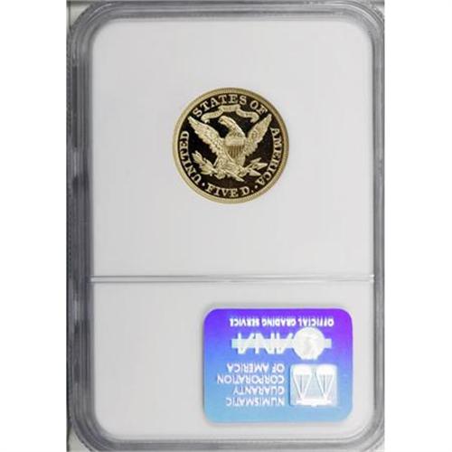 <B>1899 $5 PR66 Ultra Cameo NGC.</B></I> This 1899 half eagle, graded PR66 Ultra Cameo by NGC, is the finest example--by two grade points!--that we at Heritage have ever had the privilege to offer of this elusive issue. Only eight times before since we began maintaining auction records have we featured a proof 1899 Liberty half eagle, with seven of those in PR64 and one in PR62. <BR> This piece is also the finest in terms of cameo contrast, as it is the only Deep/Ultra Cameo certified specimen we have ever offered, regardless of numeric grade. (This is an interesting observation, in that it contradicts the truism that most 1898-1900 proof gold coins are found with deep cameo contrast.) In fact, the total certified population of 1899 half eagles in all grades at NGC and PCGS combined is only 58 coins. Of those, only 15 pieces in all grades are certified as Deep or Ultra Cameo, with an additional 17 pieces designated as Cameo.<BR> More specifically, the present PR66 Ultra Cameo example is one of three so certified at NGC, with one PR67 Ultra Cameo and four PR68 Ultra Cameos finer (as always, minus resubmissions, which likely account for a considerable percentage of the certified numbers at these lofty levels) (1/08). <BR> There is certainly no doubt about the Ultra Cameo status of this piece. This 109-year-old half eagle looks like a Franklin Mint product! There is maximum contrast between the heavily frosted devices and the unfathomable depth of reflectivity in the fields. The surfaces are nearly perfect, as one would expect from the grade, and the fields show the rippling, orange-peel effect commonly seen on proof gold from the late 1800s.<BR> Besides the usually fine distinctions between one grade level and another or between Cameo and Ultra Cameo contrast, consider for a moment, in a larger sense, <I>just how rare proof gold really is: </B></I>Of the more than 26,000 offerings of Liberty Head half eagles currently in Heritage's auction archives, only a bit more than 1%--325 pieces, to be exact--are proofs!<BR><I>From The Ultra Collection.</B></I><BR><BR><b>Shipping:</b> Coins & Currency (<a target="_blank" href="http://www.heritageauctions.com/common/shipping.php">view shipping information</a>)