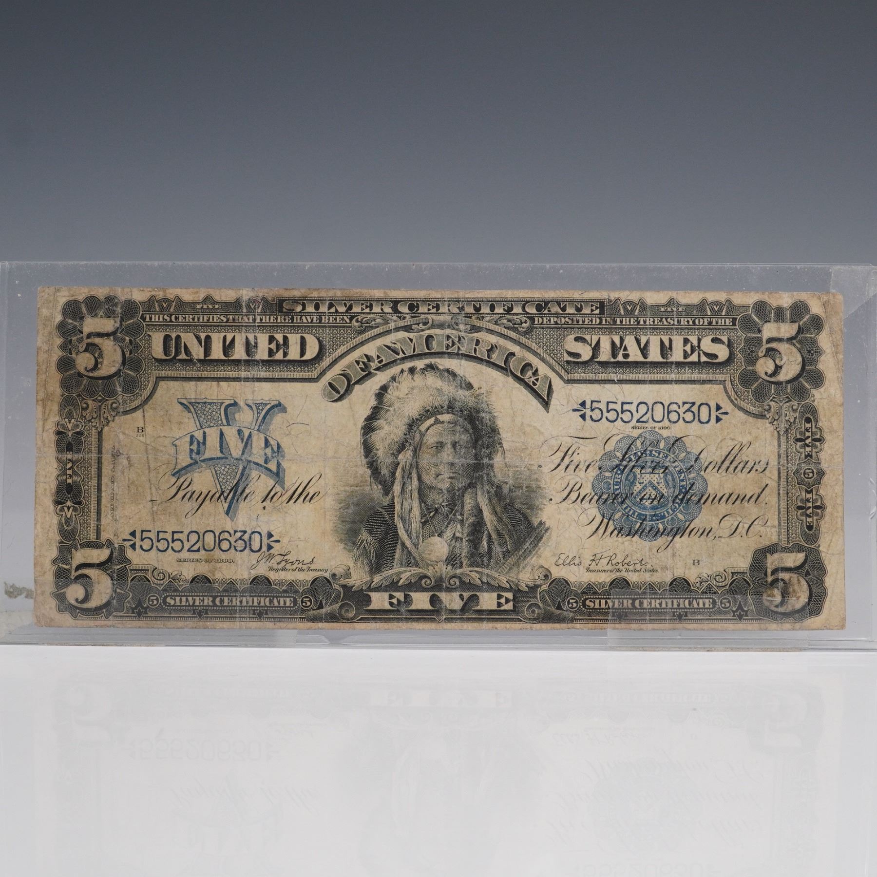 United States silver certificate dated 1899, denomination of five dollars. The obverse of the note features a central portrait of Chief Running Antelope, a distinguished Hunkpapa Lakota tribal leader. To the left of the portrait is a large blue "V" overlaid with the word "FIVE," positioned above the note's blue printed serial number "55520630." At the right, another serial number appears above a blue U.S. Treasury seal. Additional inscriptions include the phrase "Silver Certificate" at both the top and bottom, with text indicating the note is "payable to the bearer on demand." The reverse is printed in green and features ornate engravings with symmetrical elements. At the center is a decorative large "V" surrounded by a multi-layered floral-like guilloche pattern. Above the central motif is the inscription "United States of America," flanked by the words "Silver Certificate" and two classical cornucopia designs. The denomination "FIVE DOLLARS" appears in banners below, with large numeral 5s positioned in all four corners. This note is a historic example of late 19th-century U.S. currency and one of the few series to feature a Native American figure as its primary portrait.