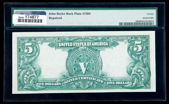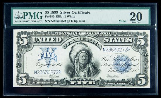1899, $5 Silver Certificate. Mule. PMG Very Fine 20. . Fr-280. The paper is bright and the colors are bold and deep on this Indian Chief, although PMG has noted some minor repairs. Still quite attractive overall.