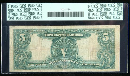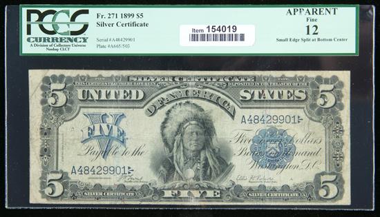 1899, $5 Silver Certificate. PCGS Apparent Fine 12. . Fr-271. . KL-241. There is a small edge split at the bottom center of this otherwise nice Indian Chief.