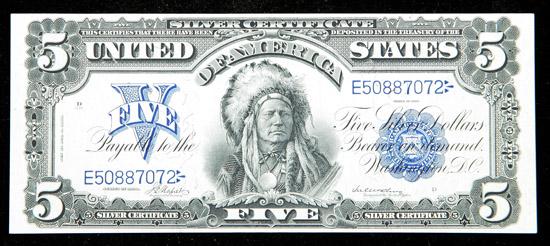 1899, $5 Silver Certificate. PCGS Extremely Fine 45PPQ. . Fr-275. A vibrant, fresh Indian Chief with only a few light folds that limit the grade. This is an interesting piece, as the silk security fibers at the left side of this note are arranged in such a way as to have randomly created a "5" just to the left of the portrait. We've never seen this before, and it appears to have happened perfectly naturally and by chance. While we aren't sure such a note will bring a premium over a "normal" Indian Chief in this grade (and this is anything but a normal note as it is virtually perfect for the grade!), we expect it might be but will leave the estimate conservative and let the bidding take the note where it might.