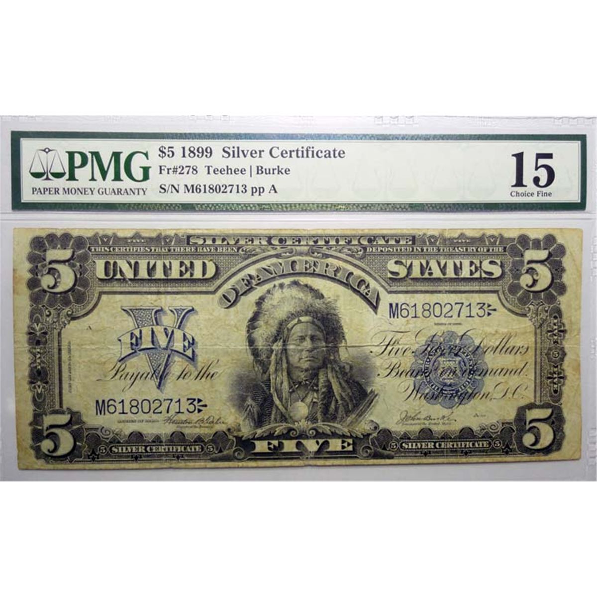 1899 $5 US SILVER CERTIFICATE INDIAN CHIEF PMG15
