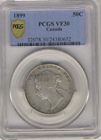 1899 50¢ PCGS VF30. Silver gray tones with large 1st 9.