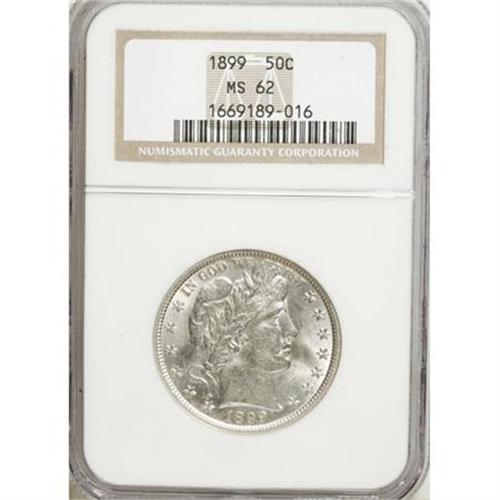 <B>1899 50C MS62 NGC.</B></I> NGC Census: (24/80). PCGS Population (45/122). Mintage: 5,538,846. Numismedia Wsl. Price for NGC/PCGS coin in MS62: $510. (#6483)<BR><BR><B>Coin Engraver:</B> Charles E. Barber<BR><BR><b>Shipping:</b> Coins & Currency (<a target="_blank" href="http://www.heritageauctions.com/common/shipping.php">view shipping information</a>)