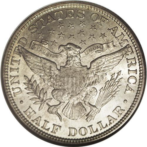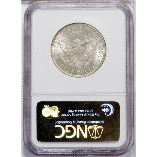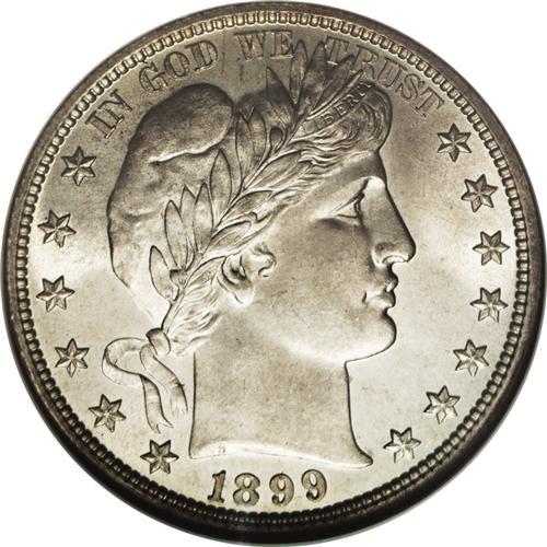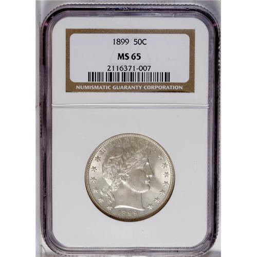 <B>1899<50C> MS65 NGC.</B></I> A light silver-gold cast graces each side of this lovely Gem, with brilliant cartwheel luster, a bold strike, and no observable deficiencies. Liberty's cheek is extremely clean for the grade, and this appealing coin appears quite high-end overall. Despite the series-record mintage of this issue, it is less available in high grades than some later pieces, and less than two dozen pieces at NGC and PCGS together exceed the present example (7/06).