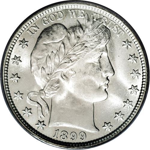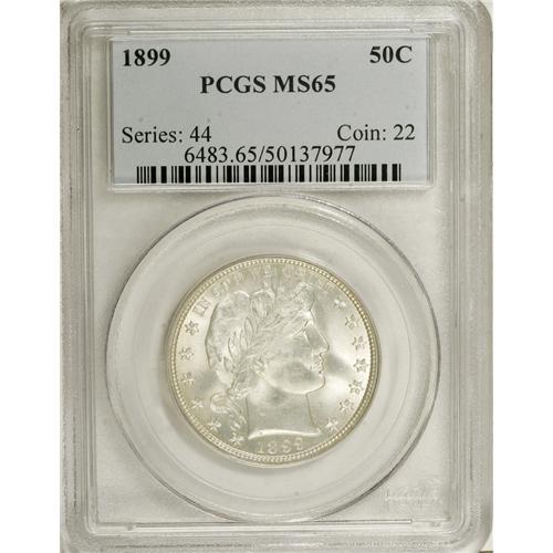 <B>1899 50C MS65 PCGS.</B></I> Surprisingly few Gems survive of this date despite the highest production figure of any issue in the series, over 5.5 million pieces. As of April 2007, PCGS and NGC combined have certified only 33 coins at the MS65 level, and 17 pieces are finer. The present specimen displays radiant, virtually white surfaces, and sharply struck design elements. A few minor luster breaks on Liberty's cheek and neck, and some minute contact marks on the reverse shield, are mentioned for accuracy. An outstanding Barber half dollar. Population: 16 in 65, 9 finer (4/07).<BR><BR><b>Shipping:</b> Coins & Currency (<a target="_blank" href="http://www.heritageauctions.com/common/shipping.php">view shipping information</a>)