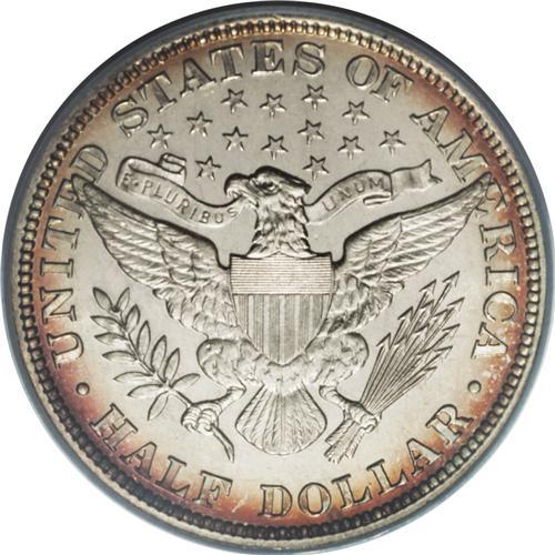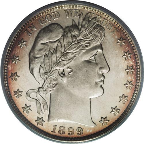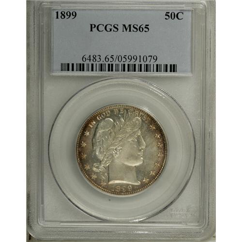 <B>1899 50C MS65 PCGS.</B></I> This boldly impressed representative has excellent luster and a trace of reflectivity in the reverse fields. Pale silver-gray patina covers most of the surfaces, though reddish-orange toning is noted at the periphery. Overall, a highly appealing and well-preserved Gem. Population: 14 in 65, 14 finer (12/06).<BR><BR><b>Shipping:</b> Coin/Currency (<a target="_blank" href="http://www.heritageauctions.com/common/shipping.php">view shipping information</a>)