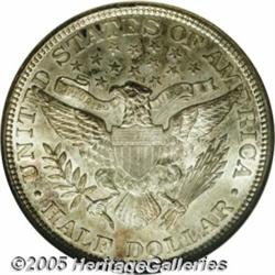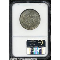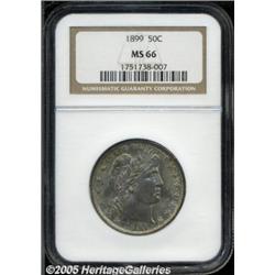 <B>1899 50C MS66 NGC.</B></I> Toned with satiny blue and gray over luster, with a fairly sharp strike on the devices. close examination will note a tiny tick on the upper part of Liberty's neck and a couple of very minor lines on her cheek. About as nice as this date is ever found, with just a small group known to equal this piece, and perhaps one or two finer. Population: 6 in 66, 0 finer (2/05).