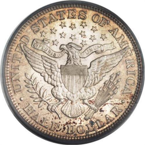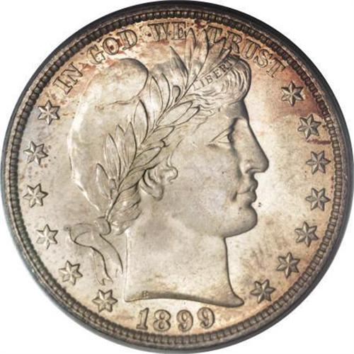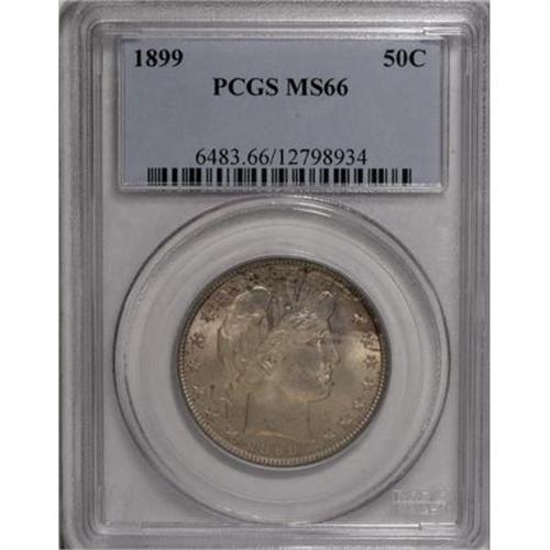 <B>1899 50C MS66 PCGS.</B></I> The original coloration in mottled shades of pink-gold, almond, and silver marks this as a special piece, as do the undisturbed surfaces and bold strike. Although the mintage was a plentiful one in excess of 5.5 million examples, PCGS has certified only 20 pieces of the issue so fine, with one higher (3/08). A nice type coin!<BR><BR><B>Coin Engraver:</B> Charles E. Barber<BR><BR><b>Shipping:</b> Coins & Currency (<a target="_blank" href="http://www.heritageauctions.com/common/shipping.php">view shipping information</a>)