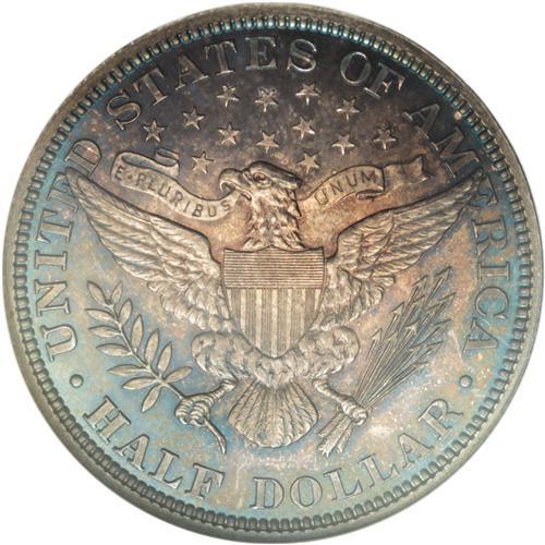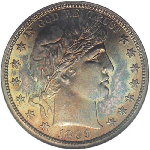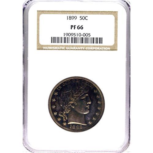 <B>1899 50C PR66 NGC.</B></I> Rose-red, orange, gold, and aqua-blue envelop the obverse, while the reverse is deeply shaded in electric-blue and plum-red. A needle-sharp specimen with full definition on the shield corners and fletchings. A scant 846 proofs were struck. Census: 23 in 66, 15 finer (4/07).<BR><BR><b>Shipping:</b> Coins & Currency (<a target="_blank" href="http://www.heritageauctions.com/common/shipping.php">view shipping information</a>)
