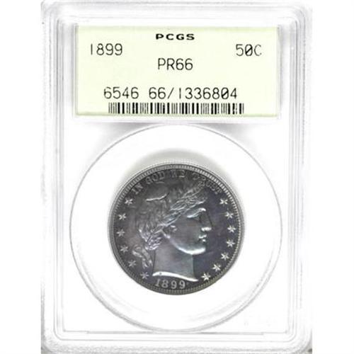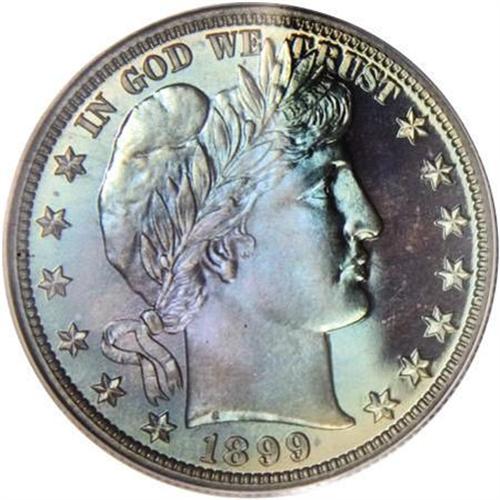 <B>1899 50C PR66 PCGS.</B></I> Iridescent cobalt-blue dominates the obverse of this Premium Gem, giving way to cobalt-blue borders and a violet central area on the reverse. Smooth proof surfaces are impeccably preserved, with no mentionable marks or spots. A solid strike brings out excellent definition on the design elements. Housed in a green-label holder. Population: 9 in 66, 5 finer (11/07).<BR><I>From The Chandler Collection.</B></I><BR><BR><B>Coin Engraver:</B> Charles E. Barber<BR><BR><b>Shipping:</b> Coins & Currency (<a target="_blank" href="http://www.heritageauctions.com/common/shipping.php">view shipping information</a>)