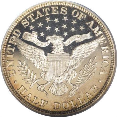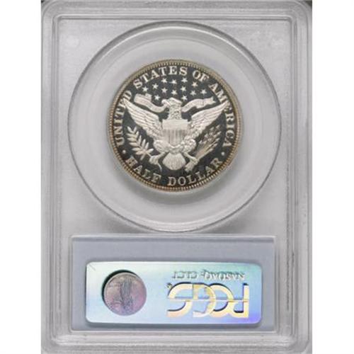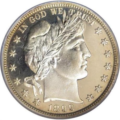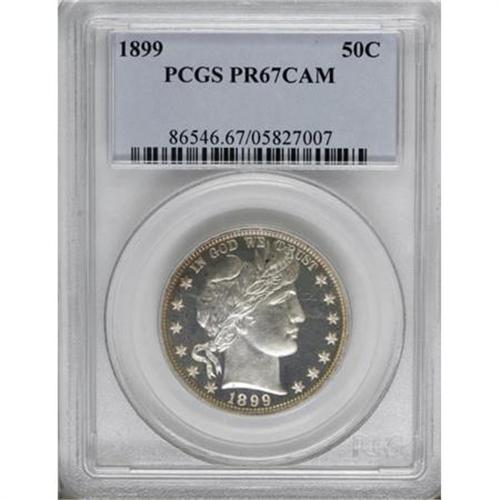 <B>1899 50C PR67 Cameo PCGS.</B></I> Delicate orange-red toning graces the margins of this razor-sharp Superb Gem. Nearly all proof Barber halves show softness of strike near the right shield corner, but the present piece is virtually fully struck. Both major devices offer consistently prominent mint frost, which provides ready contrast with the watery mirrored fields. Although the PCGS holder has a few faint marks, the coin itself is immaculate aside from a hair-thin horizontal line on the west side of the eagle's neck. This turn of the century proof issue has a tiny emission of 846 pieces, and only a tiny fraction of those coins can compete with the quality of the present specimen. Population: 3 in 67 Cameo, 0 finer as Cameo (10/07).<BR><I>From The Kallenberg #1 PCGS Registry Set Of Proof Half Dollars.</B></I><BR><BR><b>Shipping:</b> Coins & Currency (<a target="_blank" href="http://www.heritageauctions.com/common/shipping.php">view shipping information</a>)
