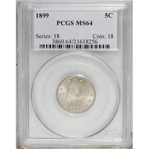 <B>1899 5C MS64 PCGS.</B></I> PCGS Population (304/205). NGC Census: (219/176). Mintage: 26,029,032. Numismedia Wsl. Price for NGC/PCGS coin in MS64: $220. (#3860)<BR><BR><B>Coin Engraver:</B> Charles E. Barber<BR><BR><b>Shipping:</b> Coins & Currency (<a target="_blank" href="http://www.heritageauctions.com/common/shipping.php">view shipping information</a>)