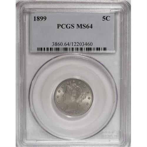 <B>1899 5C MS64 PCGS.</B></I> This is a uniformly well struck, highly lustrous near-Gem nickel with soft golden-gray color. A lengthy graze paralleling the jaw limits the grade. <BR><I>From The John Stimson, Sr. Collection, Part Two.</B></I><BR><BR><B>Coin Engraver:</B> Charles E. Barber<BR><BR><b>Shipping:</b> Coins & Currency (<a target="_blank" href="http://www.heritageauctions.com/common/shipping.php">view shipping information</a>)