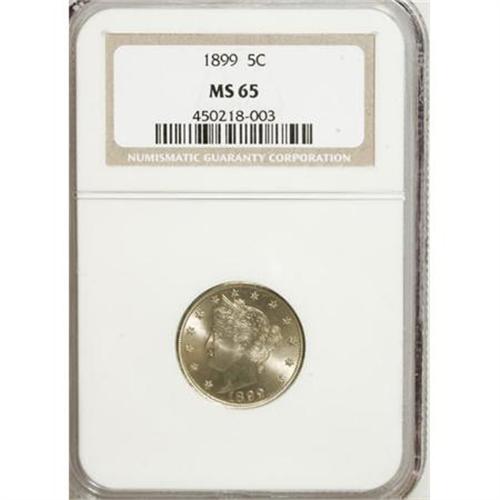 <B>1899 5C MS65 NGC.</B></I> Crisply defined in the centers with rich golden toning over most of the otherwise nickel-gray surfaces. Exquisitely preserved, though the ghost of a fingerprint is noted in the right obverse field. A lovely mid-date piece.<BR><BR><B>Coin Engraver:</B> Charles E. Barber<BR><BR><b>Shipping:</b> Coins & Currency (<a target="_blank" href="http://www.heritageauctions.com/common/shipping.php">view shipping information</a>)