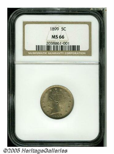 <B>1899<5C> MS66 NGC.</B></I> Fully struck and seemingly pristine, with sparkling luster and lovely golden-tan coloration over both sides. A pleasingly matte-like, grainy surface texture is seen, especially on the obverse. Population: 38 in 66, 4 finer (6/05).
