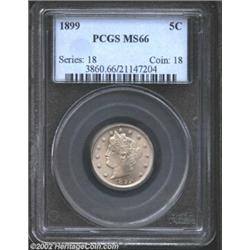 1899 5C MS66 PCGS. A boldly struck and lustrous Gem with immaculate surfaces and light green-gray patina. The eye appeal is exceptional. Population: 20 in 66, 0 finer (9/02). Important notice: We expect to be auctioning lots at the rate of 200-250 per hour. Sometimes eBay Premier live bid software cannot keep up with that pace, so we strongly recommend that you place a realistic proxy bid now as insurance to avoid disappointment. Also please note that all Heritage/CAA lots purchased through eBay Premier carry a 20% Buyer's Premium. Please make sure you read the Terms and Conditions.