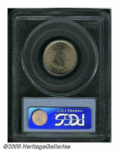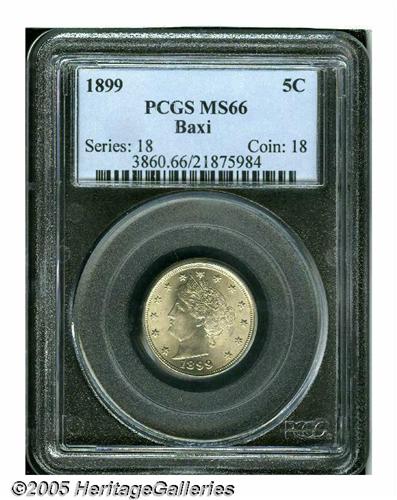 <B>1899<5C> MS66 PCGS.</B></I> Ex: Baxi Collection. Nickel-gray surfaces display radiant luster and a thin layer of gold-tan color, which takes on a streaky appearance on the reverse. The design elements are well struck, including the corn ear and leaves to the left of the bowknot, which are nicely defined. There are no mentionable contact marks to report. Population: 38 in 66, 1 finer (6/05).