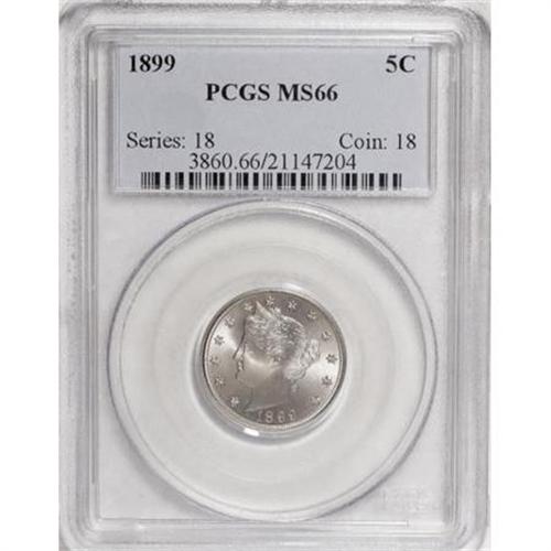 <B>1899 5C MS66 PCGS.</B></I> A boldly struck and lustrous Gem with immaculate surfaces and light green-gray patina. The eye appeal is exceptional. Population: 47 in 66, 1 finer (11/07).<BR><I>From The Madison Collection.</B></I><BR><BR><B>Coin Engraver:</B> Charles E. Barber<BR><BR><b>Shipping:</b> Coins & Currency (<a target="_blank" href="http://www.heritageauctions.com/common/shipping.php">view shipping information</a>)