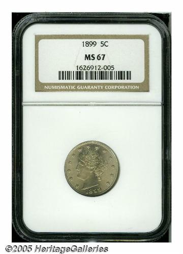 <B>1899<5C> MS67 NGC.</B></I> Both the quality of strike and surface preservation on this Superb satiny Gem are about as nice as one could ever imagine on this late 19th century issue. Just a hint of olive-gold patina is seen over shimmering mark-free surfaces. Population: 4 in 67, 0 finer (3/05).