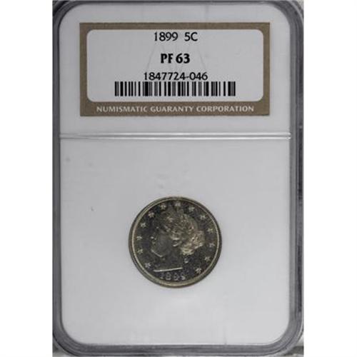 <B>1899 5C PR63 NGC.</B></I> NGC Census: (27/335). PCGS Population (58/342). Mintage: 2,031. Numismedia Wsl. Price for NGC/PCGS coin in PR63: $184. (#3897)<BR><BR><B>Coin Engraver:</B> Charles E. Barber<BR><BR><b>Shipping:</b> Coins & Currency (<a target="_blank" href="http://www.heritageauctions.com/common/shipping.php">view shipping information</a>)