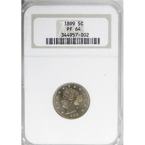<B>1899 5C PR64 NGC.</B></I> NGC Census: (101/231). PCGS Population (152/185). Mintage: 2,031. Numismedia Wsl. Price for NGC/PCGS coin in PR64: $220. (#3897)<BR><BR><B>Coin Engraver:</B> Charles E. Barber<BR><BR><b>Shipping:</b> Coins & Currency (<a target="_blank" href="http://www.heritageauctions.com/common/shipping.php">view shipping information</a>\)