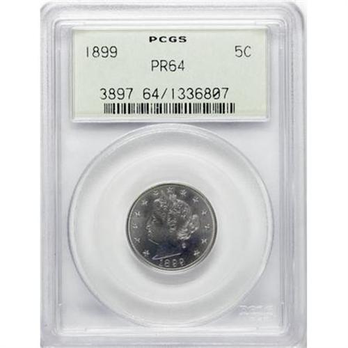 <B>1899 5C PR64 PCGS.</B></I> An exactingly struck and original Choice proof, draped in iridescent apple-green and caramel-gold shades. In an old green label holder.<BR><I>From The Chandler Collection.</B></I><BR><BR><B>Coin Engraver:</B> Charles E. Barber<BR><BR><b>Shipping:</b> Coins & Currency (<a target="_blank" href="http://www.heritageauctions.com/common/shipping.php">view shipping information</a>)