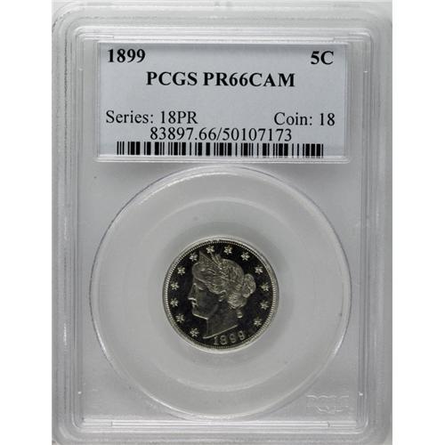<B>1899 5C PR66 Cameo PCGS.</B></I> Delicate golden-rose and blue accents adorn the moderate mirrors. The devices are boldly detailed and contrast nicely with the fields. Population: 7 in 66 Cameo, 2 finer (11/06).<BR><BR><b>Shipping:</b> Coin/Currency (<a target="_blank" href="http://www.heritageauctions.com/common/shipping.php">view shipping information</a>)