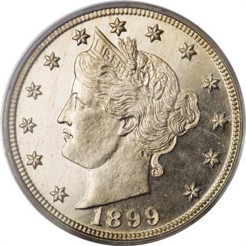 <B>1899 5C PR66 Cameo PCGS.</B></I> The frosty, razor-sharp devices present a sharp contrast against the deeply reflective fields. A hint of light, streaky gold is seen over each side of this nearly perfect proof Liberty Head nickel. A set of Cameo Liberty nickels would be an impressive run of coins, and a difficult one to assemble. In the case of the 1899, only seven other PR66 Cameo pieces have been certified by PCGS with two finer (1/08).<BR><BR><b>Shipping:</b> Coins & Currency (<a target="_blank" href="http://www.heritageauctions.com/common/shipping.php">view shipping information</a>)