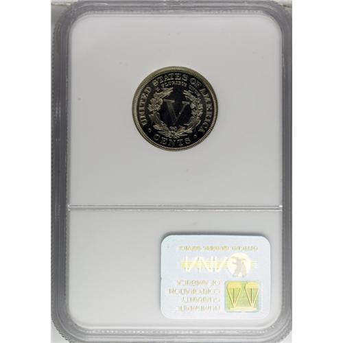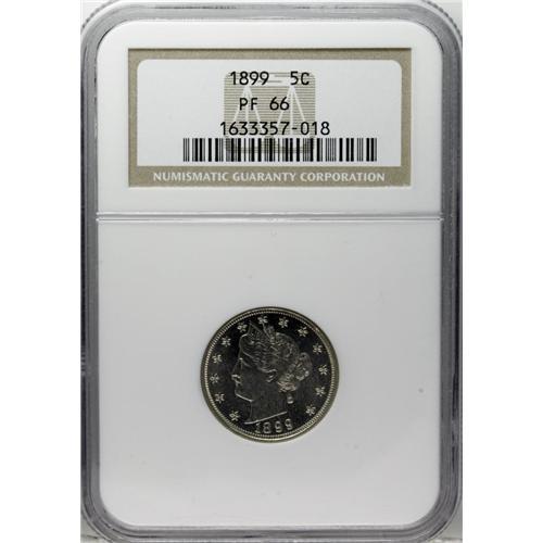 <B>1899 5C PR66 NGC.</B></I> A touch of champagne-toned haze appears on each side of this lovely proof. A contact mark appears on the thin right stroke of the V on the reverse. Census: 66 in 66, 19 finer (10/06).<BR><BR><b>Shipping:</b> Coin/Currency (<a target="_blank" href="http://www.heritageauctions.com/common/shipping.php">view shipping information</a>)