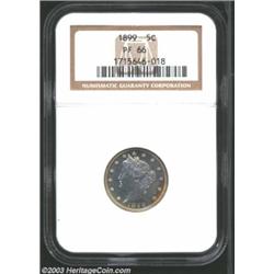 <TABLE cellSpacing=0 cellPadding=0 width="100%" bgColor=#000000 border=0><TBODY><TR><TD width="100%"><TABLE cellSpacing=1 cellPadding=3 width="100%" border=0><TBODY><TR><TD width="100%" bgColor=#79735c><FONT face=arial color=#ffffff size=3><B>Description</B> </FONT></TD></TR><TR><TD width="100%" bgColor=#ffffff><FONT face=arial size=2><B>1899 5C PR66 NGC.</B></I> The lovely lilac-blue obverse color is interrupted by bright apricot-gold iridescence near the lower rim, while the reverse exhibits the same color scheme in reverse. There is a small, curly lintmark (as struck), in the lower right obverse field, but no hairlines or handling marks are evident. Population: 66 in 66, 18 finer (7/03). </FONT></TD></TR></TBODY></TABLE></TD></TR></TBODY></TABLE><BR><A name=PricesRealized></A><TABLE cellSpacing=0 cellPadding=0 width="100%" bgColor=#000000 border=0><TBODY><TR><TD width="100%"><TABLE cellSpacing=1 cellPadding=3 width="100%" border=0><TBODY><TR><TD width="100%" bgColor=#79735c><A name=PR><FONT face=arial color=#ffffff size=3><B>Previous Prices from Heritage Auctions</B> </FONT></A></TD></TR><TR><TD bgColor=#f6f6ed><TABLE cellSpacing=0 cellPadding=0 width="100%" border=1><TBODY><TR><TD align=middle width="33%"><B>Date</B></TD><TD align=middle width="33%"><B>Service</B></TD><TD align=middle width="33%"><B>Price</B></TD></TR><TR bgColor=whitesmoke><TD width="33%"><B>08/27/2002</B></TD><TD width="33%">PCGS</TD><TD width="33%">$718.75</TD></TR><TR bgColor=whitesmoke><TD width="33%"><B>09/12/2000</B></TD><TD width="33%">PCGS</TD><TD width="33%">$633.00</TD></TR><TR bgColor=whitesmoke><TD width="33%"><B>03/18/1998</B></TD><TD width="33%">PCGS</TD><TD width="33%">$632.50</TD></TR><TR bgColor=whitesmoke><TD width="33%"><B>09/24/2002</B></TD><TD width="33%">NGC</TD><TD width="33%">$494.50</TD></TR><TR bgColor=whitesmoke><TD width="33%"><B>02/12/2000</B></TD><TD width="33%">NGC</TD><TD width="33%">$529.00</TD></TR><TR bgColor=whitesmoke><TD width="33%"><B>03/01/2000</B></TD><TD width="33%">NGC</TD><TD width="33%">$667.00</TD></TR><TR bgColor=whitesmoke><TD width="33%"><B>03/01/1999</B></TD><TD width="33%">NGC</TD><TD width="33%">$552.00</TD></TR><TR bgColor=whitesmoke><TD width="33%"><B>05/01/1999</B></TD><TD width="33%">NGC</TD><TD width="33%">$920.00</TD></TR><TR bgColor=whitesmoke><TD width="33%"><B>03/01/2003</B></TD><TD width="33%">PCGS</TD><TD width="33%">$718.75</TD></TR><TR bgColor=whitesmoke><TD width="33%"><B>04/22/2003</B></TD><TD width="33%">NGC</TD><TD width="33%">$552.00</TD></TR></TBODY></TABLE></TD></TR><TR><TD bgColor=#ffffff><FONT face=arial size=1 ?>PLEASE NOTE: All prices realized reflect the final hammer price PLUS the buyer's premium in auctions that charge a buyer's premium. Each item has a notation at the top of the listing indicating whether that lot included a buyer's premium. Example: A item that sells with a final hammer price of $100 and a 20% buyer's premium will display with a price realized of $120. All information listed is intended to be as accurate as possible, but errors are possible. Please use this guide carefully and inform us of any inaccuracies. </FONT></TD></TR></TBODY></TABLE></TD></TR></TBODY></TABLE><BR><TABLE cellSpacing=0 cellPadding=0 width="100%" bgColor=#000000 border=0><TBODY><TR><TD width="100%"><TABLE cellSpacing=1 cellPadding=3 width="100%" border=0><TBODY><TR><TD width="100%" bgColor=#79735c colSpan=6><FONT face=arial color=#ffffff size=3><B>Price Guide*</B> </FONT></TD></TR><TR bgColor=#f6f6ed><TD align=middle><B>Grade</B> </TD><TD align=middle><B>Coin World<BR>(Trends)</B> </TD><TD align=middle><B>Numismedia<BR>Retail</B> </TD><TD align=middle><B>Numismedia<BR>Wholesale</B> </TD><TD align=middle><B>Coin<BR>Universe</B> </TD><TD align=middle><B>Heritage<BR>Value Index</B> </TD></TR><TR bgColor=#ffffff><TD align=middle>65</TD><TD align=right>---</TD><TD align=right>$600.00</TD><TD align=right>$480.00</TD><TD align=right>$600.00</TD><TD align=right>$371.50</TD></TR><TR style="FONT-WEIGHT: bold" bgColor=#cccfdd><TD align=middle>66</TD><TD align=right>---</TD><TD align=right>$880.00</TD><TD align=right>$675.00</TD><TD align=right>$825.00</TD><TD align=right>$528.75</TD></TR><TR bgColor=#ffffff><TD align=middle>67</TD><TD align=right>---</TD><TD align=right>---</TD><TD align=right>$1,625.00</TD><TD align=right>$2,400.00</TD><TD align=right>$1,680.00</TD></TR><TR bgColor=#ffffff><TD colSpan=6><FONT size=1>*All information listed is intended to be as accurate as possible, but errors are possible. No item may be returned or refused based on this information which is provided as a service to our customers. You should contact each pricing source directly to determine the accuracy of this information. </FONT></TD></TR></TBODY></TABLE></TD></TR></TBODY></TABLE><BR><TABLE cellSpacing=0 cellPadding=0 width="100%" bgColor=#000000 border=0><TBODY><TR><TD width="100%"><TABLE cellSpacing=1 cellPadding=3 width="100%" border=0><TBODY><TR><TD width="100%" bgColor=#79735c><FONT face=arial color=#ffffff size=3><B>Population Guide</B> </FONT></TD></TR><TR bgColor=#ffffff><TD align=middle><!-- Begin Output of Population Grid--><TABLE cellSpacing=0 cellPadding=0 width="100%" border=0><TBODY><TR><TD vAlign=center><TABLE cellSpacing=0 width="100%" border=1 cellsadding="3"><TBODY><TR><TD vAlign=center><TABLE cellSpacing=0 cellPadding=3 width="100%" border=1><TBODY><TR><TD vAlign=center align=middle bgColor=#f0f1e8 colSpan=2 <CENTER><FONT face=Arial size=2><B>PCGS Pop </B></FONT><CENTER></CENTER></TD><TD vAlign=center align=middle bgColor=#f0f1e8 colSpan=2><CENTER><FONT face=Arial size=2><B>NGC Pop</B></CENTER></FONT></TD></TR><TR><TD vAlign=center><FONT face=Arial size=2>(66)</FONT> </TD><TD vAlign=center align=right><FONT face=Arial size=2>35</FONT> </TD><TD vAlign=center><FONT face=Arial size=2>(66)</FONT> </TD><TD vAlign=center align=right><FONT face=Arial size=2>66</FONT> </TD></TR><TR><TD vAlign=center><FONT face=Arial size=2>(>66)</FONT> </TD><TD vAlign=center align