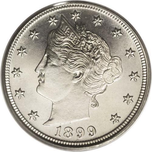 <B>1899<5C> PR67 PCGS.</B></I> One of the glories of the Troy Wiseman Collection of Liberty nickels is that the obverse and reverse of each coin are so evenly matched in color. So it is with this piece, which offers pretty sunset-gold and heather toning on both sides. The strike is full, and radiant luster arises from the surfaces. Population: 6 in 67, 1 finer (8/06).<BR><I>From The Troy Wiseman Collection.</B></I>