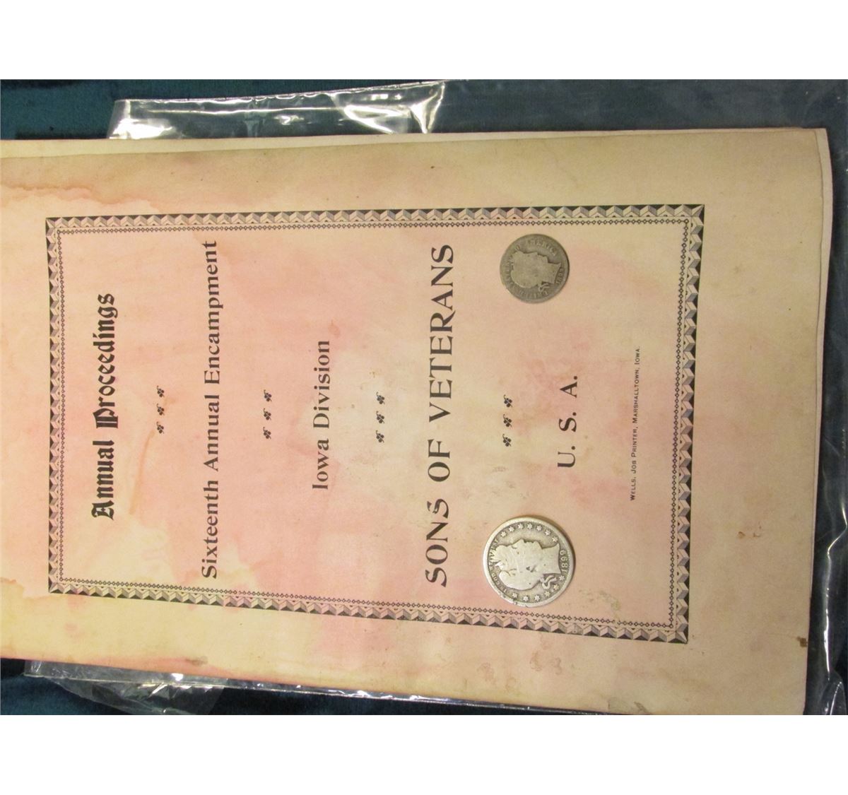 1899 "Annual Proceedings Sixteenth Annual Encampment Iowa Division Sons of Veterans U.S.A." & 1899 P Barber Dime and Quarter, Good condition.