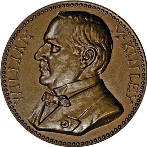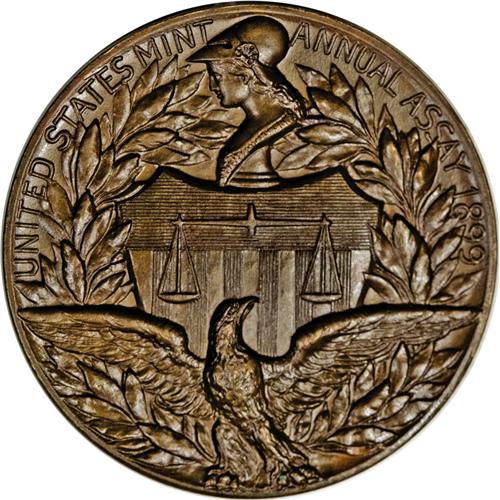 <B>1899 Assay Commission Medal. MS64 Brown Uncertified.</B></I> Julian AC-43, R.5. Copper, 34.0 mm., 322.5 grains. The obverse is identical to the 1898 medal, and apparently from the same die. The reverse has a bust of Pallas above a shield, with an eagle below. Scales are superimposed on the shield, and the entire design is enclosed by a wreath, with the legend UNITED STATES MINT ANNUAL ASSAY 1899 above. According to official records, just 10 examples of this medal were struck in copper or bronze, with 40 pieces produced in silver. This relative rarity is supported by a review of auction offerings. This is a gorgeous example, perhaps deserving of the Gem grade designation, with glossy olive and reddish-brown surfaces. All design elements are boldly defined.<BR><I>Ex: Saccone Sale (Bowers and Merena, 11/1989), lot 3490; G. Lee Kuntz Collection (Superior, 10/1991), lot 2257.</B></I>
