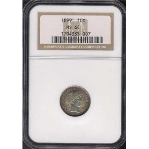 <b>1899 Barber Dime. NGC graded MS64.</b> Displaying a uniform satiny brilliance on each side with the silvery luster modified by original "antique" looking patina. Keen-edged devices throughout, including the wreath and all letters in the legends <b>(PCGS # 4818)</b>