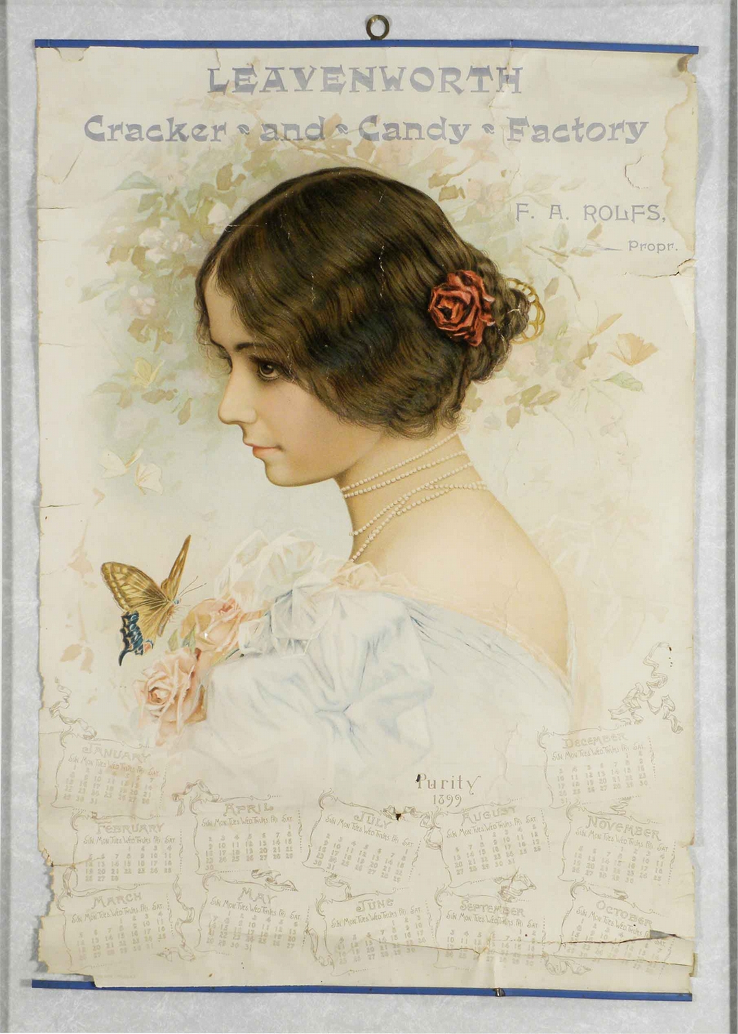 1899 Calendar for Leavenworth Cracker and Candy Factory. Depicting woman with butterfly. F. A. Rolfs Proprietor. Framed under glass with original bands. Tears, stains and paper loss, fair condition. 13 1/2 X 19 1/2 inches image only.