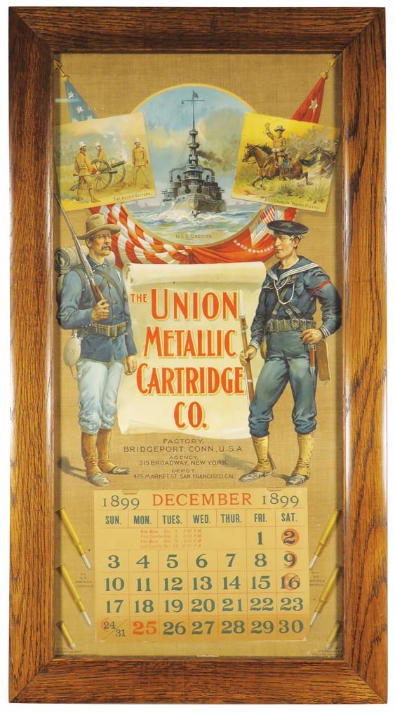 1899 Calendar for The Union Metallic Cartridge Co. Factory, Bridgeport, Conn. USA. Dec. page only, original bands top and bottom. Framed under glass. Excellent condition. 13 1/2 X 28 inches image only.