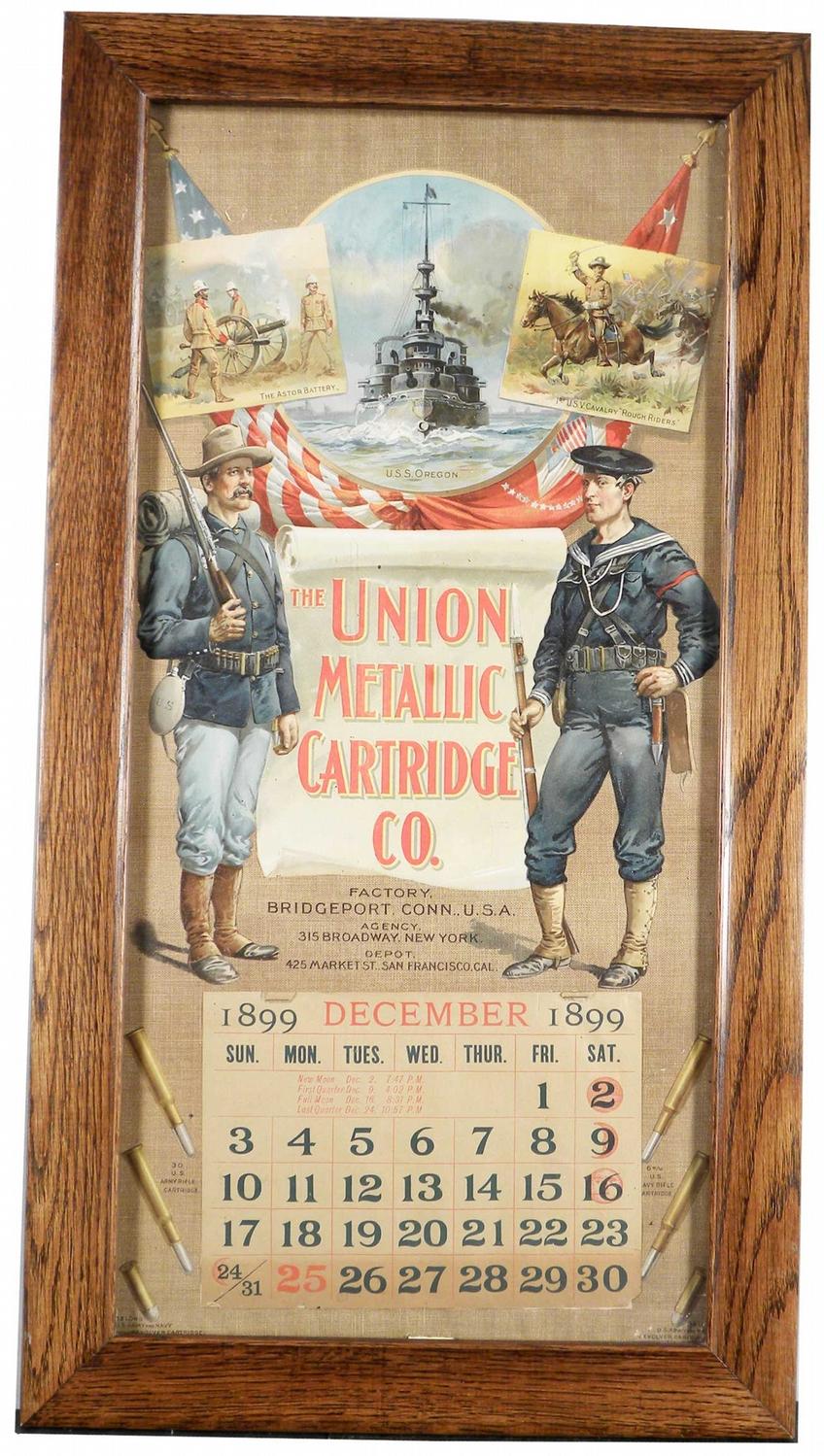 1899 Calendar for The Union Metallic Cartridge Co. Factory Bridgeport Conn. USA. Dec page only, bands top and bottom. Framed under glass. Excellent condition. 13 1/2 X 28 inches.
