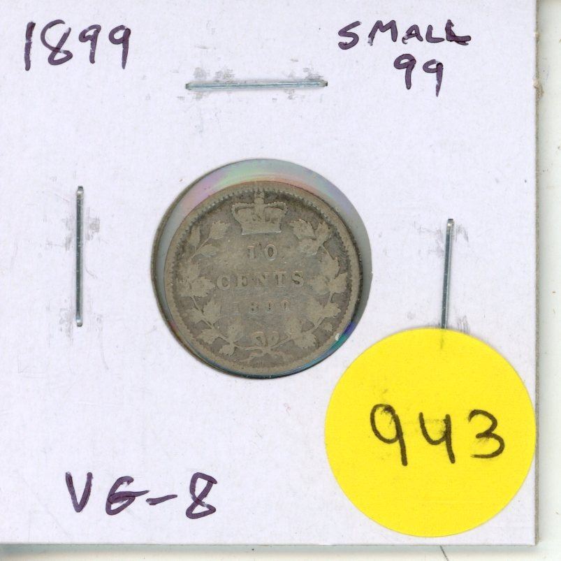 1899 Canadian Victorian Silver 10 Cents. Small 99 variety. VG-8.