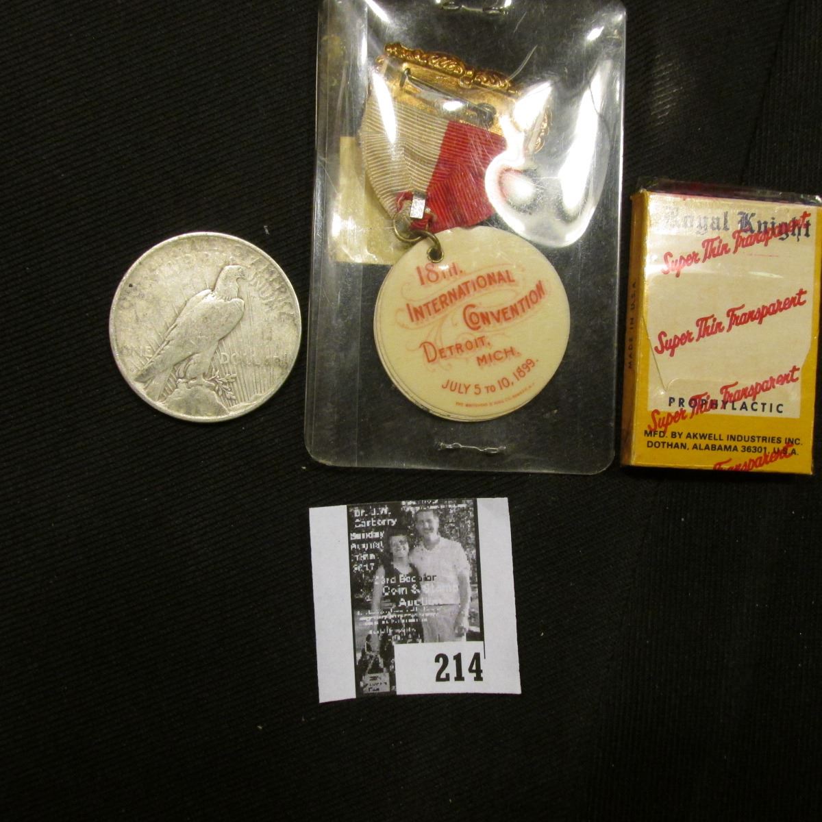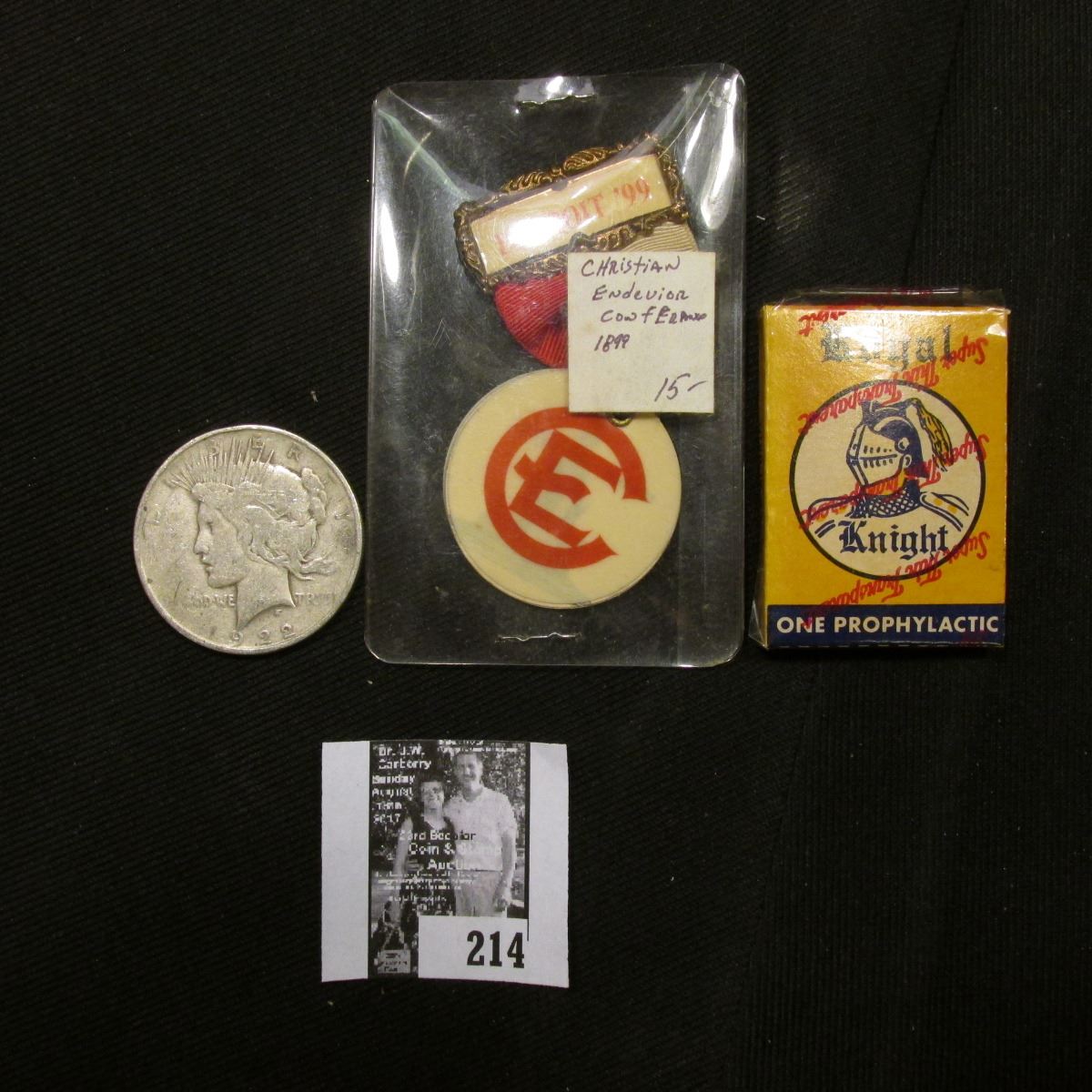 1899 Christian Endeavor Conference Pin-back from Detroit; &1922 D U.S. Peace Silver Dollar, VG; & a "Royal Knight One Prophylactic". An interesting combination.