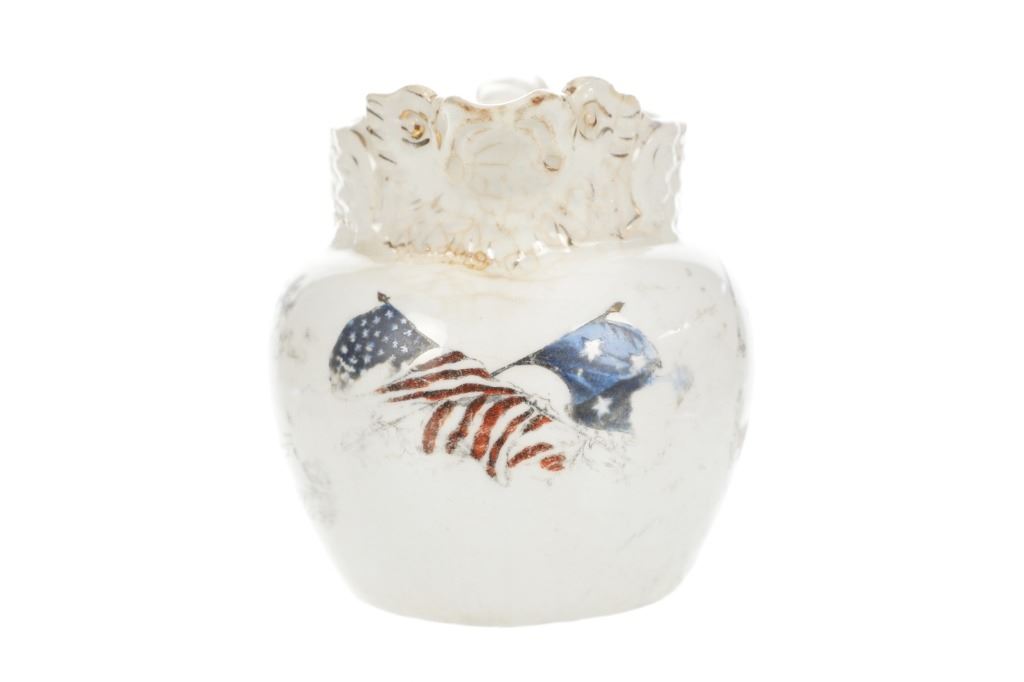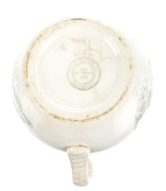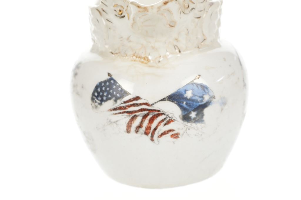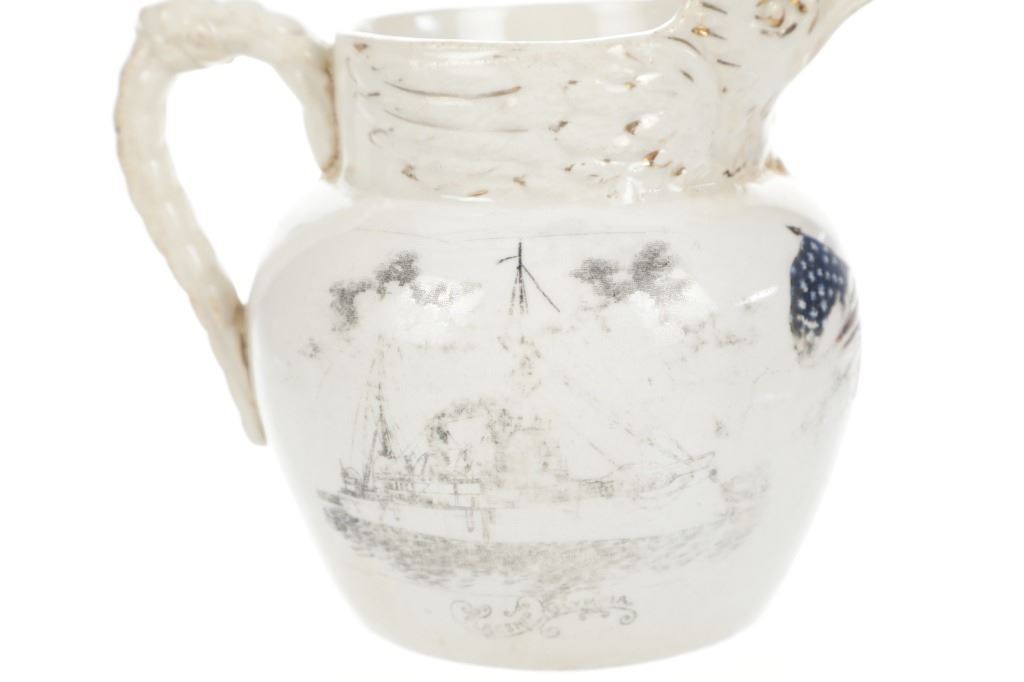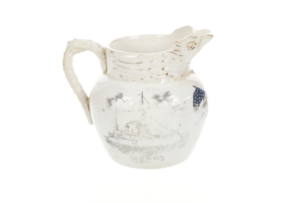 Featured in this lot is this Cook Pottery cream pitcher of Flagship Olympia, circa 1899. The cream pitcher is an antique piece that commemorates Admiral Dewey, called "U.S. Navy Hero of Manila," and depicts his flagship 'Olympia' and shows a cameo of the Admiral. The piece celebrates his victory in the Spanish-American War. The pitcher was made in Trenton, New Jersey and patented in 1899; it shows the hallmark for Cook Pottery Co. on the bottom of the vessel. The condition of this cream pitcher is fair, with the painted etching to the cameo and the decoration of the vessel and some fading to the flag pictorials. The measurements of this cream pitcher are 4 1/4" x 4 3/4" x 3 3/4".
