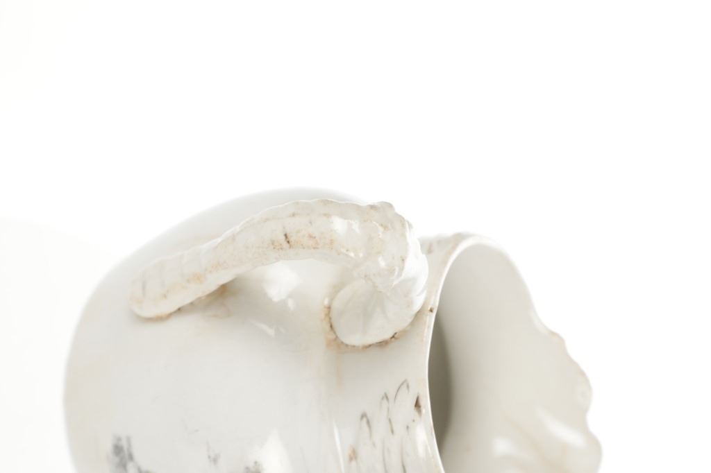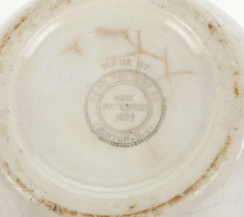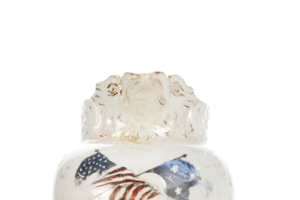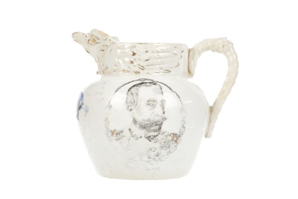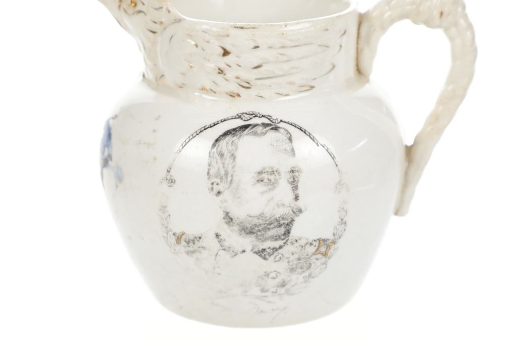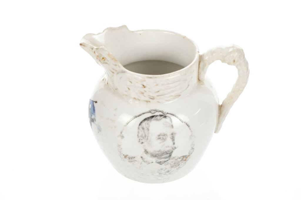 Featured in this lot is this Cook Pottery cream pitcher of Flagship Olympia, circa 1899. The cream pitcher is an antique piece that commemorates Admiral Dewey, called "U.S. Navy Hero of Manila," and depicts his flagship 'Olympia' and shows a cameo of the Admiral. The piece celebrates his victory in the Spanish-American War. The pitcher was made in Trenton, New Jersey and patented in 1899; it shows the hallmark for Cook Pottery Co. on the bottom of the vessel. The condition of this cream pitcher is fair, with the painted etching to the cameo and the decoration of the vessel and some fading to the flag pictorials. The measurements of this cream pitcher are 4 1/4" x 4 3/4" x 3 3/4".