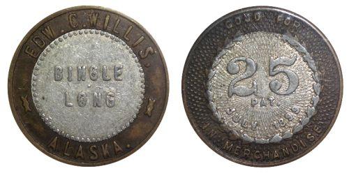 Brass with aluminum center plug, 28mm, R8. Reverse: Good for 25 cents in Merchandise (Pat. July 1899). Obverse: Edw. C. Willis "Bingle Long", Alaska. This is among one of the very few Alaskan tokens to actually bear the word 'BINGLE" the common Alaskan te