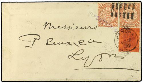 1899 Envelope to Lyon, France, franked Chinese 5c(2) cancelled bars + QV 10c. tied by Shanghai date